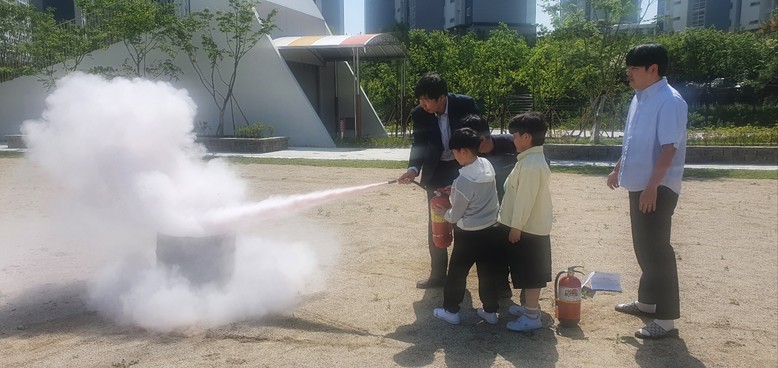 6학년 기○○ 학생이 담당자와 함께 시범을 보이고, 1학년 학생들은 지시에 따라 화재진압용 소화기를 사용해 불을 끄는 방법을 배웠다.