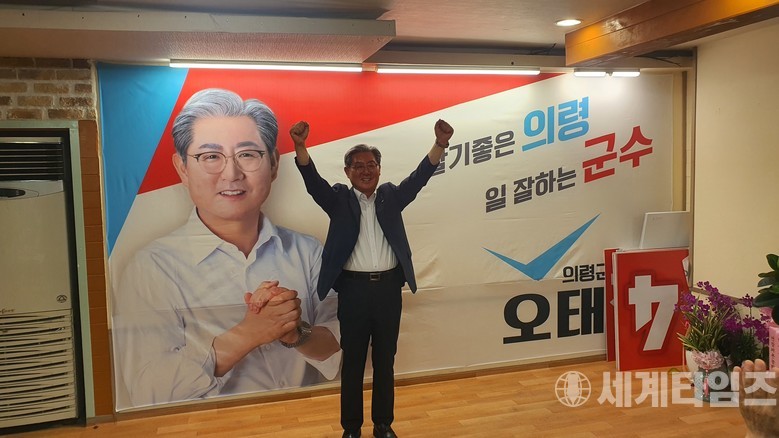 [세계타임즈 = 이진화 기자] 제8회 전국동시지방선거에서 당선으로 재선을 확정지은 무소속 오태완 의령군수 당선자가 3일 해단식을 갖고 기념촬영을 하고 있다.(사진=오태완 당선자 캠프 제공)
