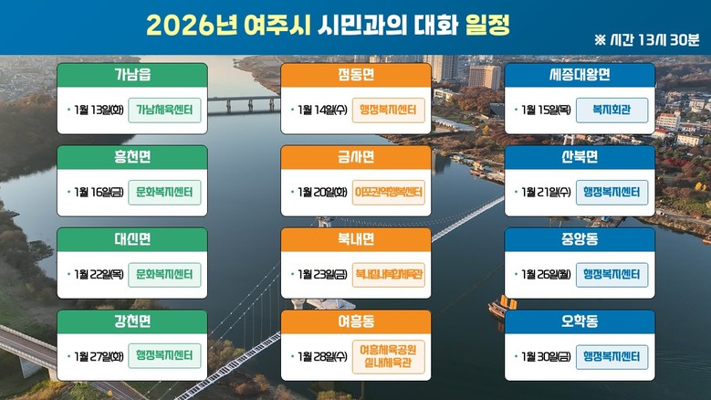 ‘2026년 시민과의 대화’는 △2026.1.13.(가남읍, 가남체육센터) △2026.1.14.(점동면, 행정복지센터) △2026.1.15.(세종대왕면, 복지회관) △2026.1.16.(흥천면, 문화복지센터) △2026.1.20.(금사면, 이포권역행복센터) △2026.1.21.(산북면, 행정복지센터) △2026.1.22.(대신면, 문화복지센터) △2026.1.23.(북내면, 북내실내복합체육관) △2026.1.26.(중앙동, 행정복지센터) △2026.1.27.(강천면, 행정복지센터) △2026.1.28.(여흥동, 여흥체육공원 실내체육관) △2026.1.30.(오학동, 행정복지센터) 순으로 진행된다.