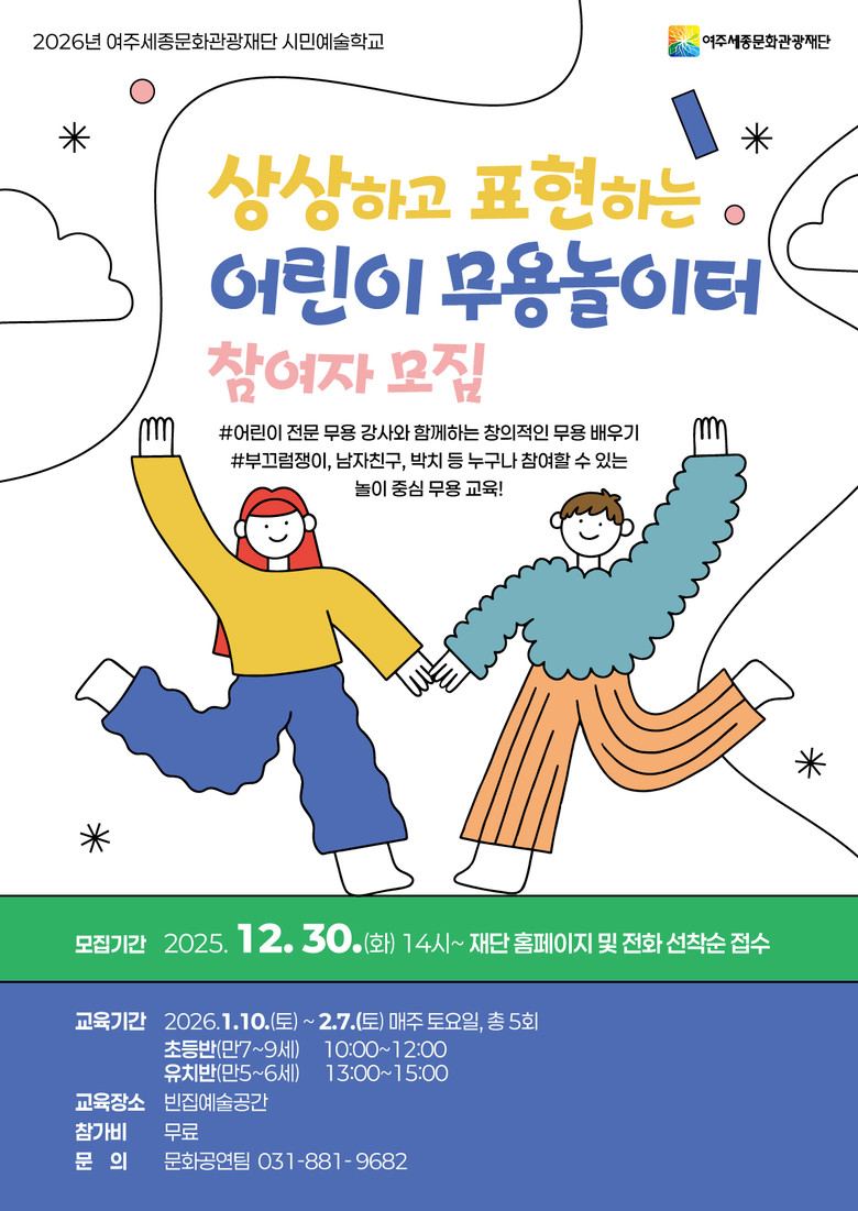 - 몸의 리듬과 창의성을 일깨우는 놀이형 무용 교육 [세계타임즈=여주시 송민수 기자] 여주세종문화관광재단은 오는 1월 10일부터 시민예술학교 <상상하고 표현하는 어린이 무용 놀이터>를 진행한다.