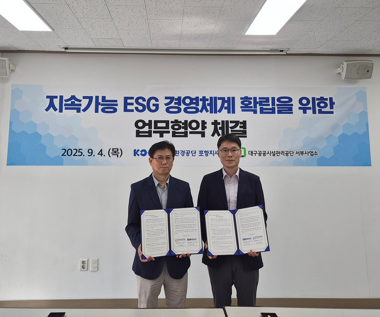 ▸ 업무 노하우·사회공헌 활동 공유로 지속 가능한 협력 체계 구축 [세계타임즈=대구 한윤석 기자] 대구공공시설관리공단(이사장 문기봉) 서부사업소는 9월 4일(목) 해양환경공단 포항지사와 ‘지속가능성 확보 및 지역 상생발전을 위한 기후변화 대응과 ESG 경영’ 추진 업무협약(MOU)을 체결했다.