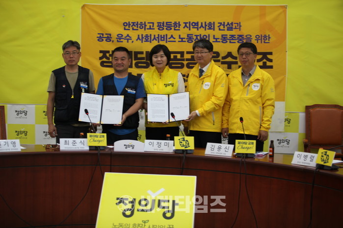 정의당 이정미 상임선대위원장, 전국공공운수노동조합 정책협약식후 모습 사진=이연종기자