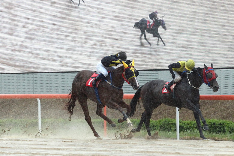 그러나 직선주로에 들어서자 진풍경이 연출됐다. 결승선 300m 전방 ‘이클립스베리’에 기승한 문세영 기수가 채찍을 반대편 손으로 넘기는 과정에서 채찍을 땅으로 떨어뜨린 것이다. 그 사이 경주로 안쪽에서 추입하던 ‘글로벌태양’은 ‘이클립스베리’를 맹추격했고 결승선 100m에 이르자 ‘이클립스베리’를 넘어섰다.