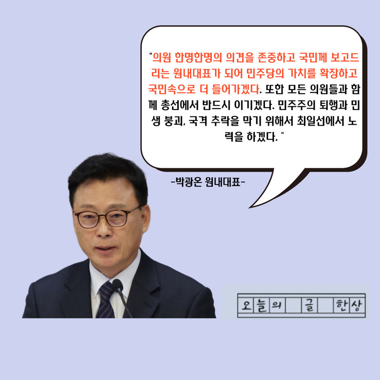 이날 박광온 신임 원내대표는 이낙연계로 분류되는 의원으로 현재 이슈가 되고 있는 이재명 대표 체제에서 이낙연계 박 의원이 원내사령탑을 차지하면서 정치권에서는 민주당 의원들이 이 대표에 대한 '불신임' 을 주장하고 있다.