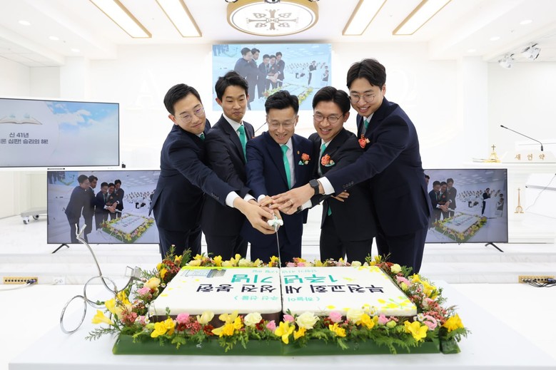 | ▲지난 8일 신천지 부천교회가 ‘새 성전 봉헌 1주년 기념 예배’에서 케익 커팅식을 진행하고 있다. [사진 제공 = 신천지 부천교회] |
