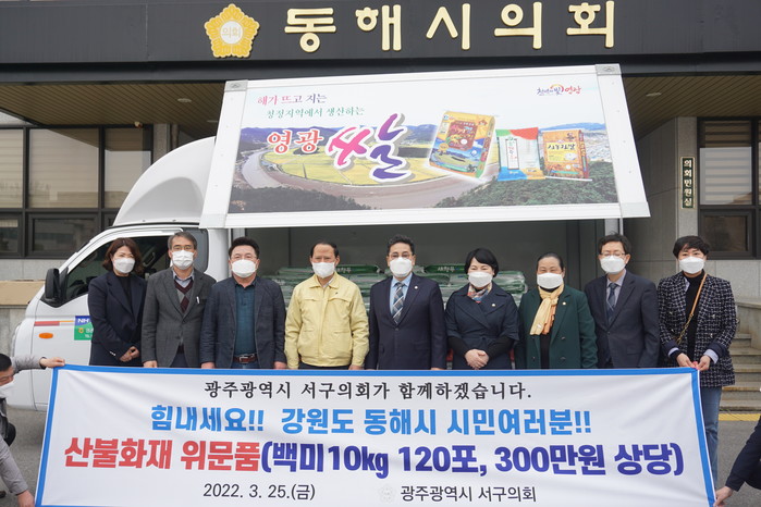 [동해시=세계타임즈 김민석 기자] 평창군의회(부의장 이주웅)와 광주광역시 서구의회(의장 김태영)는 24일과 25일, 동해시의회(의장 김기하)를 방문해 동해 산불 피해 복구와 이재민 지원을 위해 써달라며 각각 복구지원 성금 100만원과 300만원 상당 쌀과 성금을 전달했다.