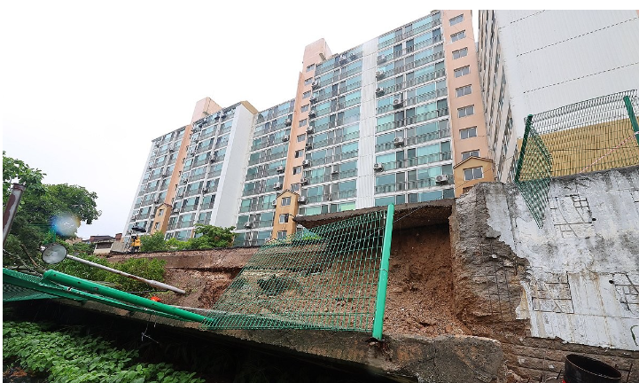 집중호우로 인천 강화군 갑곳리의 한 아파트 옹벽이 무너져 있다[사진=연합뉴스]