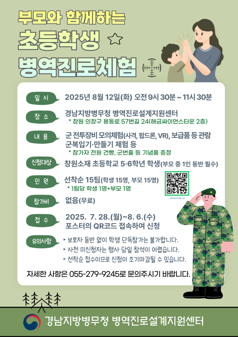 [세계타임즈]최성룡기자 =경남지방병무청(청장 김종원)은 오는 8월 12일 창원대 동문에 있는 병역진로설계지원센터에서「부모와 함께하는 초등학생 병역진로체험」행사를 시행한다고 밝혔다.