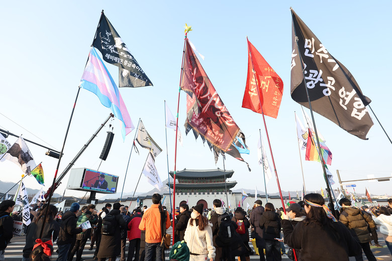 윤석열 대통령 탄핵 촉구 집회에 모인 깃발들