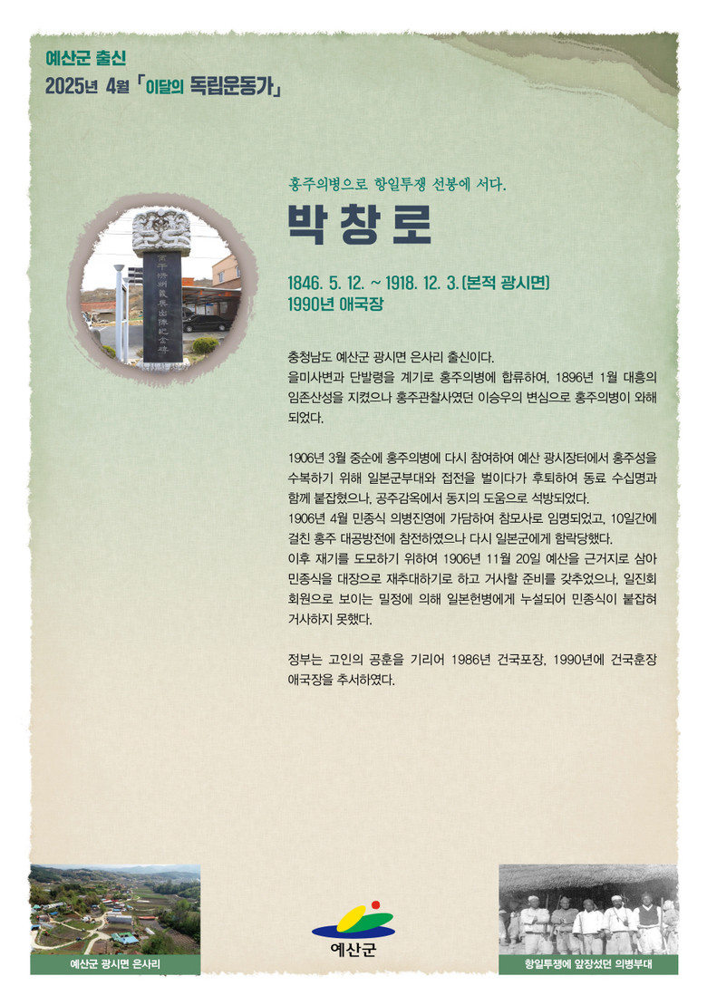 박창로 독립운동가는 을미사변과 단발령을 계기로 홍주의병에 합류해 1896년 1월 대흥 임존산성을 지켰으나 홍주관찰사였던 이승우의 변심으로 홍주의병은 와해됐다.