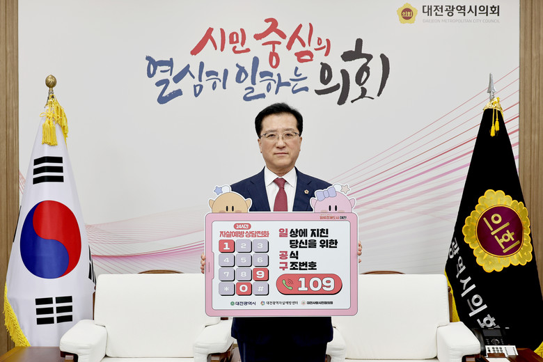 [대전 세계타임즈=이채봉 기자] 대전시의회 조원휘 의장은 8일, 일류 생명 존중 도시 대전 구현을 위한‘내 마음을 살리는 번호 109’자살예방 릴레이 캠페인에 동참했다.