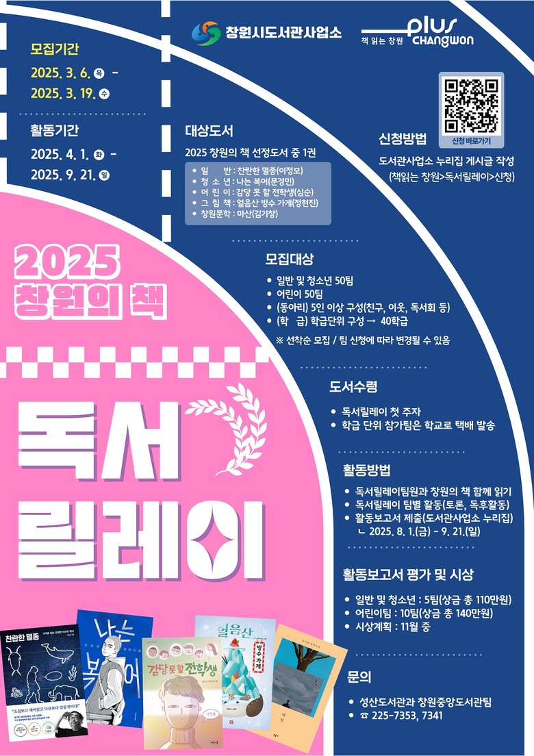 ‘독서릴레이’란 가족, 이웃, 친구 등 5명 이상이 팀을 구성하여 ‘2025 창원의 책’ 선정도서 중 1권을 선택하여 팀원들과 책을 이어 읽고, 다양한 독후활동을 통해 창원의 책을 함께 즐기는 독서운동이다.