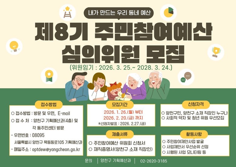 참여를 원하는 구민은 양천구청 기획예산과 또는 각 동 주민센터 방문, 이메일(optdew@yangcheon.go.kr)로 신청하면 된다. 최종 선정 결과는 2월 27일 양천구 홈페이지 게시 및 개별 통보로 안내된다.
