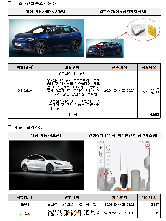 ③ (폭스바겐) ID.4 82kWh 4,886대는 정보전자제어장치 소프트웨어 오류에 따라 속도계, 후방카메라 화면 등이 표시되지 않는 안전기준 부적합으로 6월 28일부터 시정조치에 들어간다.