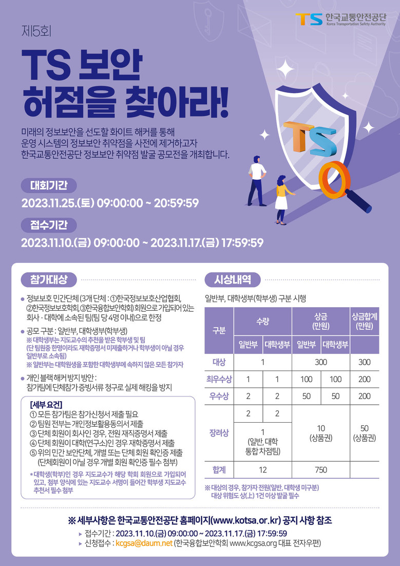 참가 대상은 블랙해커*에 의한 불법 해킹 방지를 위해 정보보호 민간단체인 한국정보보호협회, 한국정보보호학회, 한국융합보안학회 회원 중 회사 또는 대학에 소속된 팀(4명 이내)으로 한정되며,