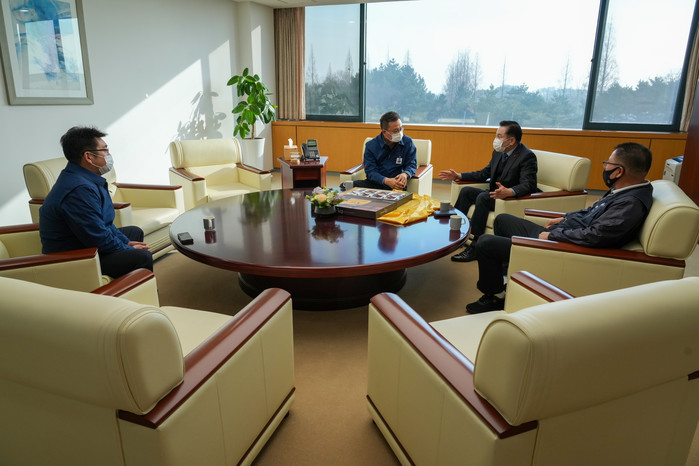 [세계타임즈 김동현 기자] 송지용 전라북도의회 의장은 11일 신임 최준혁 현대자동차 전주공장장과 면담을 갖고, 전주공장의 빠른 정상화 및 지역경제와의 상생을 당부했다.