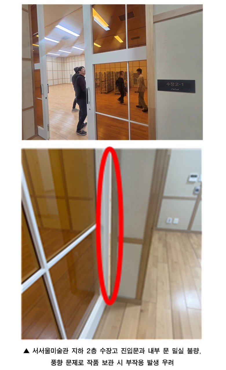 - 지하 2층 수장고, 문 사이 간격으로 밀실 불량 현상, 풍향기 과대 설치로 작품 손상 우려