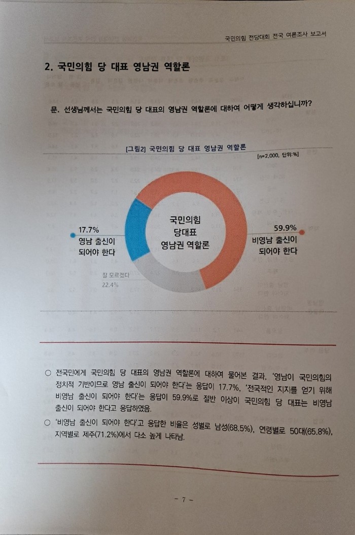 여기에 국민의힘 당 대표 영남권 역할론에 비영남권 당 대표 출신 59.9%라는 수치는 특정 지역 출신 당권 지배에 대한 거부감을 드러낸 것으로 풀이되는 대목에 가깝다.