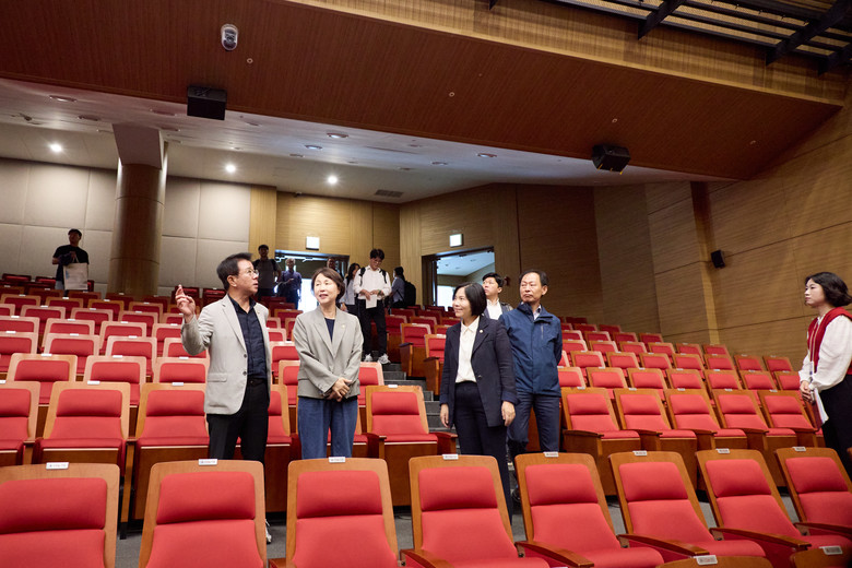 ▲ 왼쪽부터 김윤선 도시건설위원장, 유진선 의장, 신현녀 경제환경위원장 등이 벡스코(BEXCO) 공연시설(오디토리움)을 둘러보고 있다. |