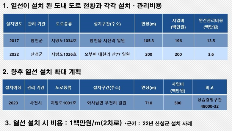 신 의원은 “2022년 현재 경남의 상습결빙구간은 총 369곳('22년 기준)에 총 길이 578km인데, 블랙아이스 방지 시설은 표지판 295개, 자동염수분사장치 50개 등으로 결빙을 막을 가장 확실한 시설인 도로 열선은 2곳 뿐”이라고 밝혔다(표3).