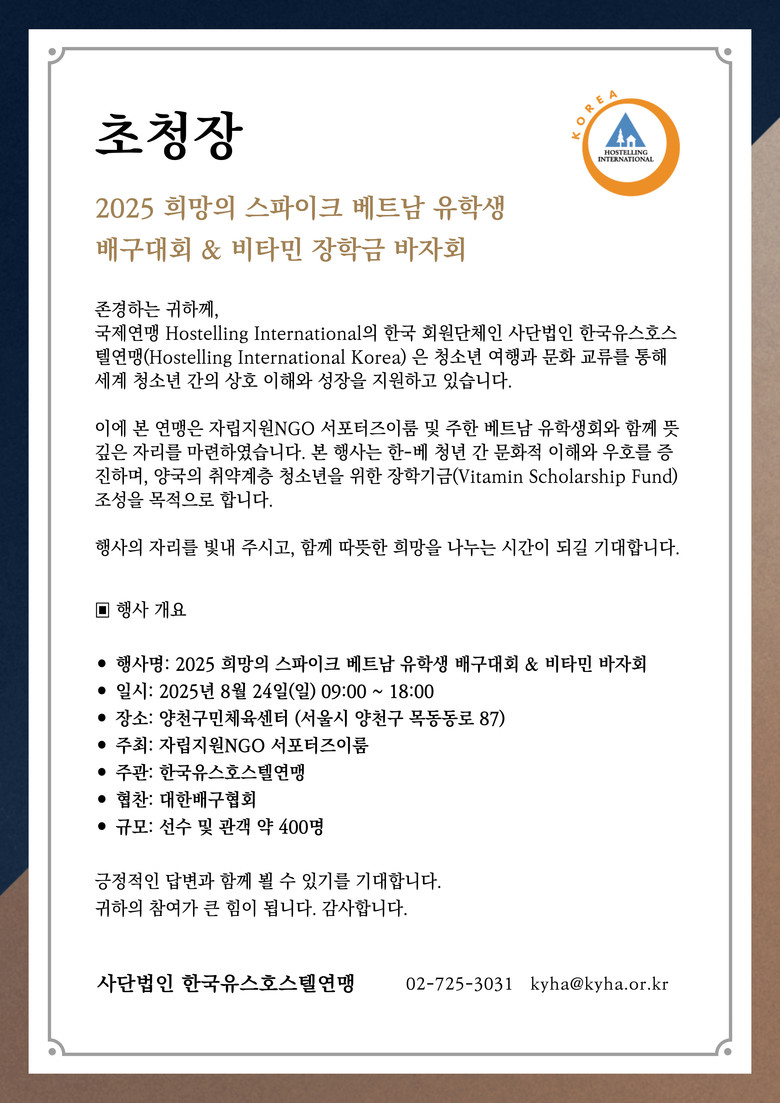 오는 8월 24일 양천구에 위치한 양천구민센타에서 자립지원NGO 서포터즈이룸이 주최하고 (사)한국유스호스텔연맹, 세계교류연합(유엔스페셜협의기구)가 주관하며 대한배구협회가 협찬하는 “2025년 희망의 스파이크 베트남 유학생 배구대회 & 비타민 장학금 바자회”가 개최된다.