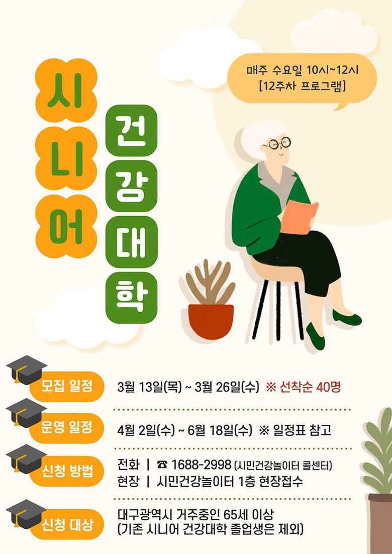이와 함께, 시니어 건강대학의 세부과정으로 3월부터 10월까지 ‘65+건강 정보 이해력 교육’을 16주 차로 신설해 노년층 건강격차 해소를 돕고, 근감소증 예방과 낙상 방지를 위한 12주 차 근력 강화 운동 교육도 실시한다.
