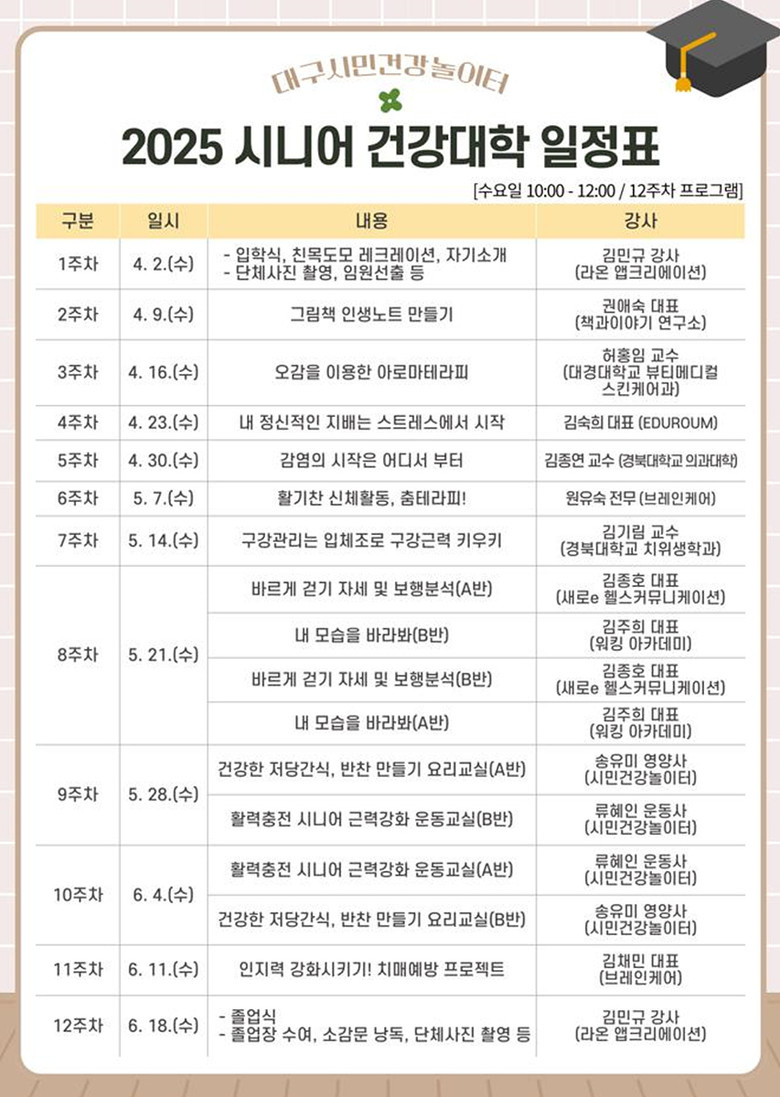 올해 시니어 건강대학은 반기별 1회, 각 12주 차 과정으로 운영하며, 노년기의 체계적인 몸·마음 건강관리를 위해 맞춤형 주제를 선정해 전문가의 강의와 체험·실습 위주로 다채롭게 구성하여 선보인다.