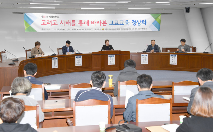 [광주=세계타임즈 손권일 기자] 광주광역시의회(의장 김동찬)는 11월22일 오후3시 시의회 5층 예산결산특별위원회의실에서 김나윤 의원을 좌장으로 광주시 고교교육 정상화 관련 토론회를 개최했다.