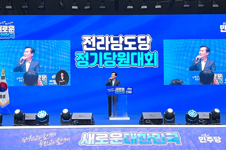 [세계타임즈 = 심귀영 기자] 주철현(전남 여수갑) 국회의원이 4일 오후 나주 종합스포츠파크에서 열린 정기 당원대회에서 민주당 전남도당 위원장에 단독 입후보해 선출됐다. 사진은 주 후보가 정견 발표를 하는 모습. 2024.8.4 [민주당 전남도당 제공. 재판매 및 DB 금지]