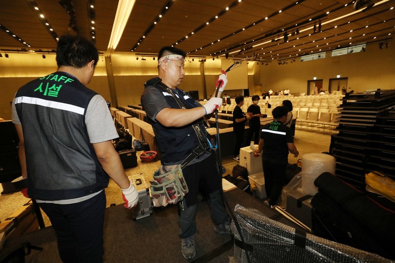 [세계타임즈 = 백진욱 기자] 17일 오후 HWPL 봉사자들이 9.18 평화만국회의 9주년 기념식 행사가 열릴 호텔에서 전기관련 시설을 설치하고 있다.