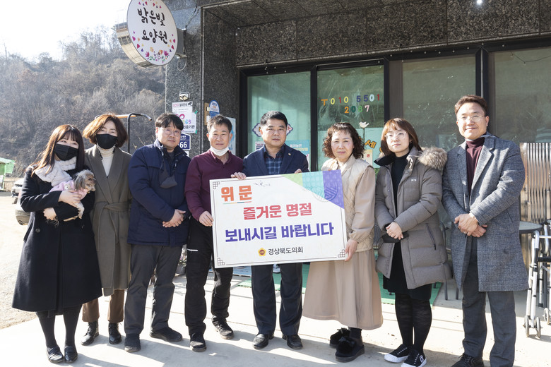 이날 문경시 우지동에 소재한 밝은빛 요양원(노인요양공동생활가정)을 방문하여 입소 어르신들이 따뜻한 설 명절을 보내실 수 있도록 도의회에서 준비한 생필품 등 위문품을 전달하며 뜻깊고 소중한 시간을 가졌다.