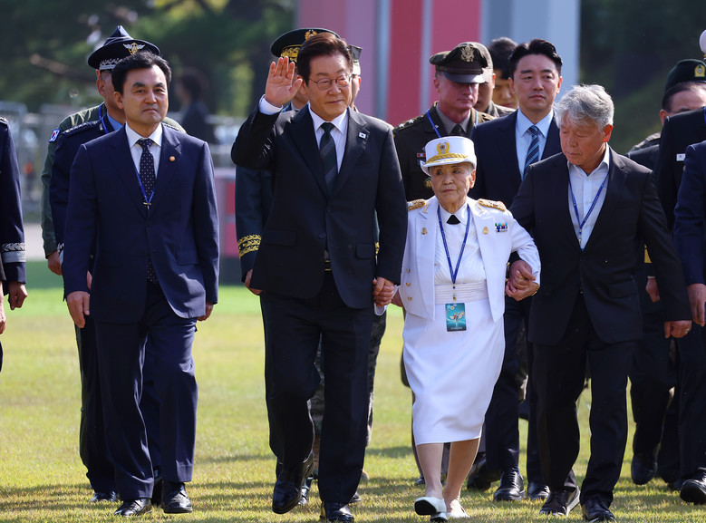 [세계타임즈 = 이채봉 기자] 이재명 대통령이 1일 취임 후 처음 맞은 국군의날 기념식에 참석하기 위해 3군(軍) 지휘부가 위치한 충남 계룡대를 찾았다.이 대통령은 이곳에서 국민에게 신뢰받는 군을 만들겠다는 의지를 강조했다.검은 양복에 회색과 녹색이 섞인 넥타이를 맨 이 대통령은 6·25 전쟁에 간호장교로 참전한 95세 이종선 씨와 해군 UDT 하사로 전역한 산악인 엄홍길 씨 등 국민대표 7명과 동반 입장했다.