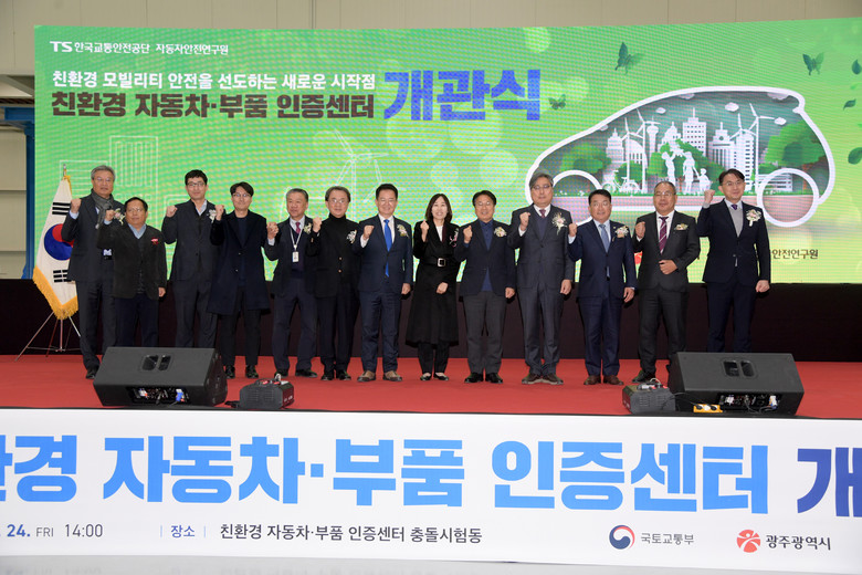 광주광역시(시장 강기정)는 24일 빛그린산단에서 강기정 광주광역시장과 정무창 광주광역시의회 의장, 이용빈 국회의원, 엄성복 한국교통안전공단 자동차안전연구원장, 김진철 광주경제자유구역청장 등이 참석한 가운데 ‘친환경 자동차·부품 인증센터’ 개관식을 가졌다.