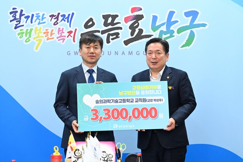 [세계타임즈=남구 손권일 기자] 광주시 남구는 8일 구청 열린민원실에서 남구 발전을 위한 고향사랑기부금 전달식을 가졌다.