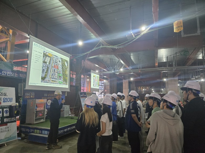 이어 2부 현장 견학에서는 학생들이 오피스텔 신축 공사 현장을 방문해 프로젝트 개요와 주요 시공 공법을 살펴보고, 학과 수업에서 배운 이론이 실제 건축 현장에 어떻게 적용되는지 체험했다.