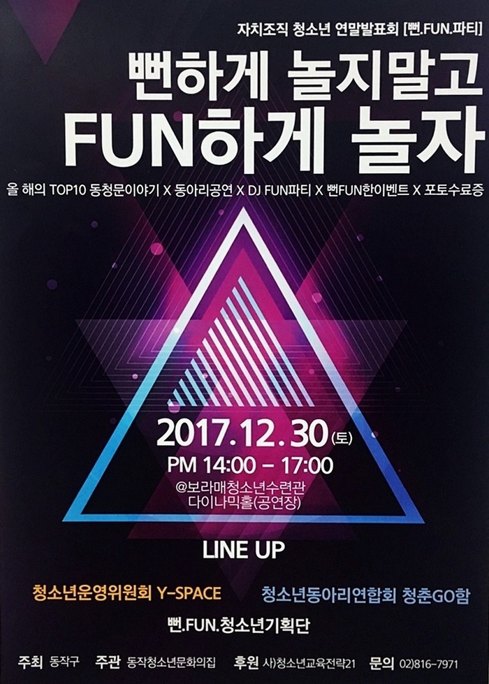 동청문에서 주관하는 ‘뻔.FUN.파티’는 ‘뻔하게 놀지말고 FUN하게 놀자’는 의미로 청소년운영위원회, 청소년동아리연합회가 한자리에 모여 한 해를 마무리하는 발표회가 운영 될 계획이다.