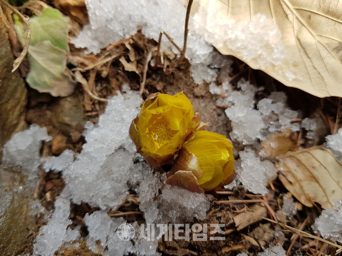[증평군=세계타임즈 이현진 기자] 19일 눈이 녹아서 비가 된다는 ‘우수’를 맞아 증평읍 율리 좌구산휴양림에 봄의 전령 복수초가 노란 꽃망울을 활짝 피워 등산객과 휴양랜드 숙박객의 눈길을 끌고 있다.