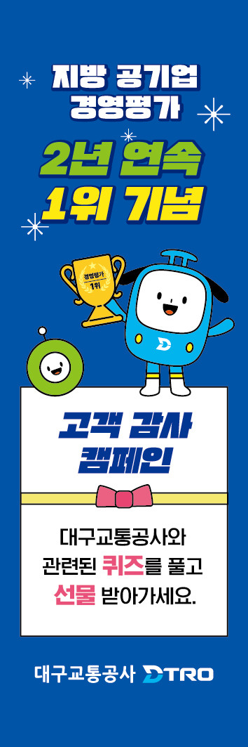 김기혁 대구교통공사 사장은 “공사 창립 30주년과 경영평가 2년 연속 1위의 성과는 시민의 성원이 있었기에 가능했다”며, “감사의 마음을 담아 다양한 행사를 마련했으니, 시민들이 많이 참여해 주시기를 바란다”고 말했다.