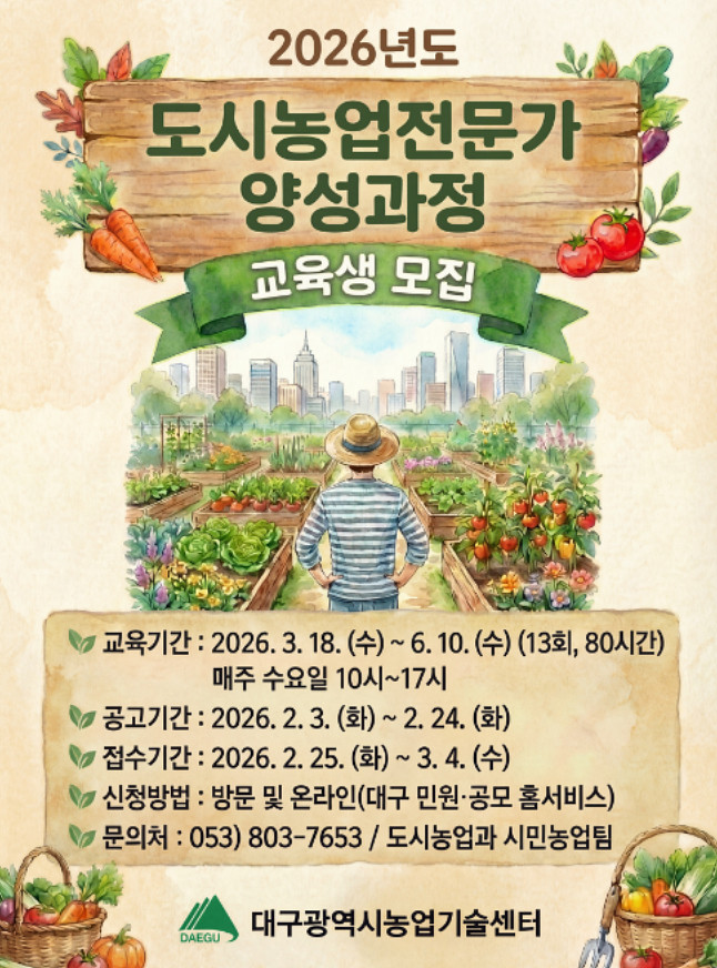 ▸ 이론·실습 병행 총 80시간 전문교육 운영 [세계타임즈=대구 한윤석 기자] 대구광역시농업기술센터는 단순한 농사 기술 습득을 넘어 도시 생태계 보전과 정서 함양 등 도시농업을 선도할 시민을 대상으로 ‘2026년도 도시농업전문가 양성과정’을 운영한다.
