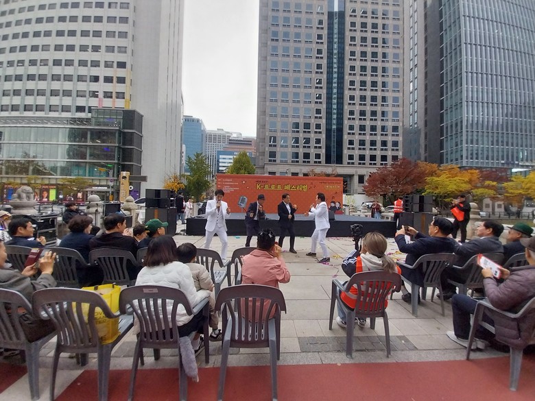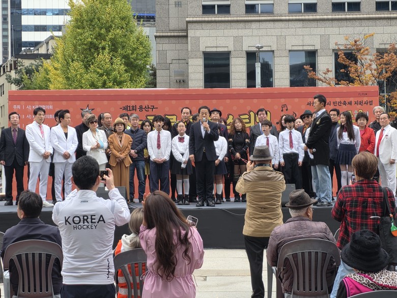 | ▲ 지난 11월 8일 광화문 청계광장(청계천 광통교 특설무대)에서 열린 ‘제1회 용산구 K-트로트 페스티벌’에 추진위원장으로 참여한 김용호 서울시의원(맨 앞 중앙)이 인사말과 함께 개회선언을 하고 있다. |