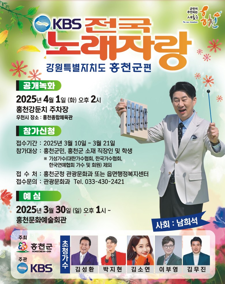 전국노래자랑 홍천군 편은 4월 1일 오후 2시 홍천강 둔치주차장에서 공개녹화로 이루어지며, 우천 시에는 홍천종합체육관에서 진행 예정이다.