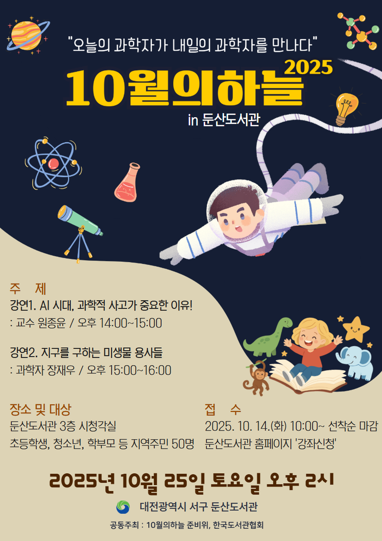 해당 프로그램은 ‘오늘의 과학자가 내일의 과학자를 만나다'라는 주제로 10월의 하늘 준비 위원회와 한국도서관협회가 공동주최하며, 지난 2010년 정재승 박사의 제안으로 시작해 전국 공공도서관에서 동시 진행된다.