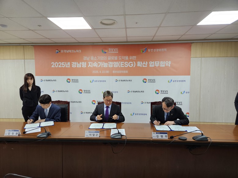 세 기관은 수출(예정)중소기업, 대기업·공공기관 협력 중소기업의 공급망 지속가능경영(ESG) 대응력 강화를 위해 △동반성장위원회 ESG 컨설팅 지원 및 ESG 우수 중소기업 확인서 발급 △경남테크노파크 현장지원단 신설 및 사후관리 강화 △성과 공유를 통한 도내 대기업·공공기관의 협력중소기업 ESG 지원 유도 등에 협력하기로 했다.