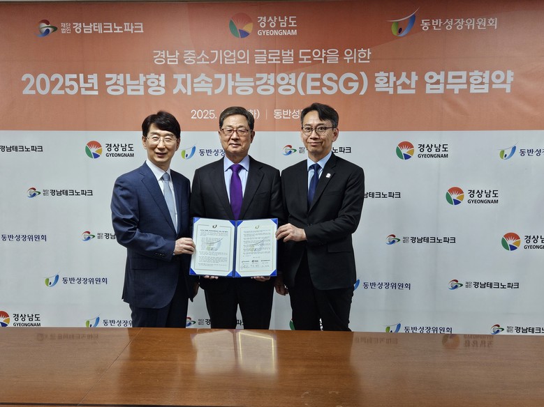 - 경남 소재 대기업·공공기관의 협력중소기업의 ESG 지원 기대 [세계타임즈=경남 최성룡 기자] 경상남도(도지사 박완수)는 경남테크노파크, 동반성장위원회와 22일 서울 동반성장위원회에서 ‘2025년 경남형 지속가능경영(ESG) 확산 사업’ 업무협약을 체결했다.