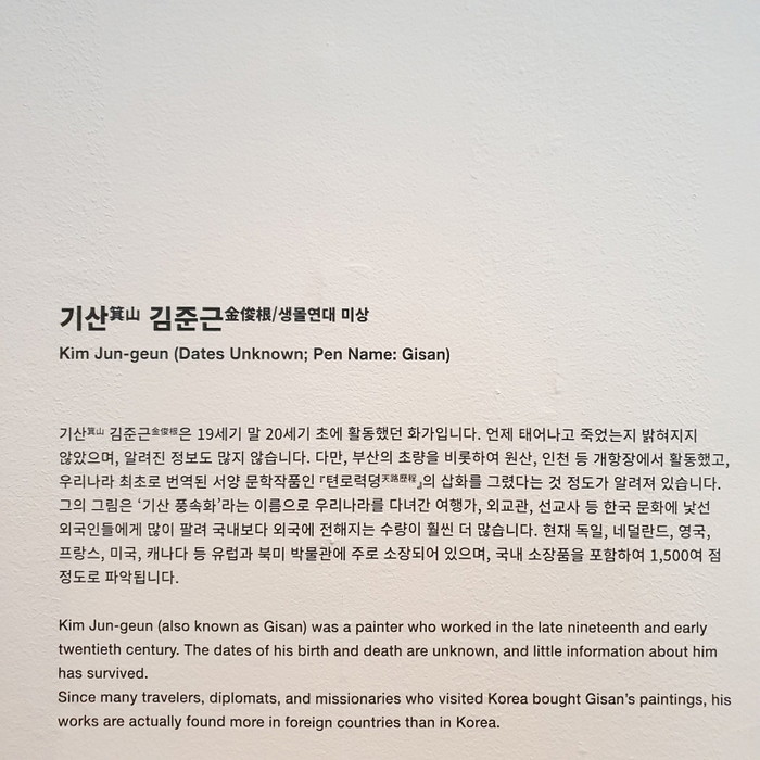 전시설명은 기산 김준근에 대해 "조선시대 대표 풍속화 가인 단원(檀園) 김홍도(金弘道, 1745~?)나 혜원(蕙園) 신윤복(申潤福, 1758~?)처럼 잘 알려진 인물은 아니지만, 생업과 의식주, 의례, 세시풍속, 놀이 등 전 분야의 풍속을 그렸다. 그래서 그의 그림은 당시에 우리나라를 다녀간 여행가, 외교관, 선교사 등 외국인에게 많이 팔렸으며, 현재 독일, 프랑스 등 유럽과 북미 박물관에 주로 소장돼 있다. 이번 전시는 미술사, 민속학 등 관련 분야 연구자들에게는 관심 대상이었지만, 일반인에게는 생소한 기산 김준근의 존재와 그의 풍속화 세계를 널리 알리는 자리가 될 것"이라고 설명했다.