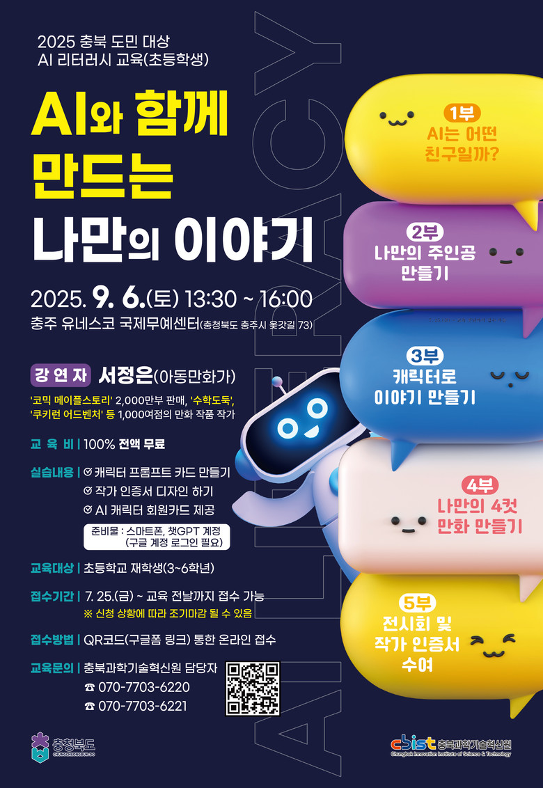 충북과기원 고근석 원장은 “이번 교육은 AI 시대를 살아갈 어린이들이 미래 기술에 대한 이해와 창의적 사고력을 함께 기를 수 있도록 기획되었다”며, “앞으로도 도민의 눈높이에 맞춘 다양한 AI 교육 프로그램을 확대해 나가겠다”고 밝혔다.
