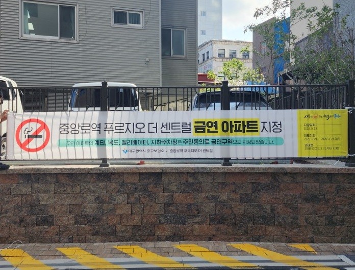 [중구 세계타임즈=한윤석 기자] 대구 중구(구청장 류규하)는 공동생활공간 내 간접흡연으로부터 주민 건강을 보호하고 쾌적한 금연 환경을 조성하기 위해 ‘대구역 센트럴 대원칸타빌’(태평로 224)과 ‘중앙로역 푸르지오 더 센트럴’(서성로 60)을 각각 제24호, 제25호 공동주택 금연구역으로 지정했다.