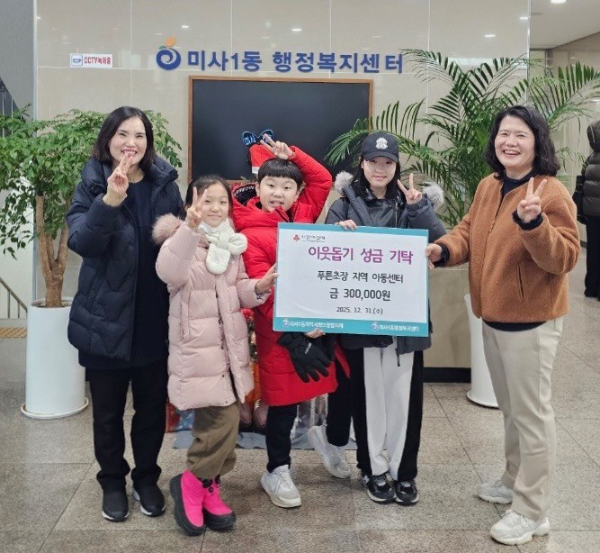 [하남시 세계타임즈=송민수 기자] 하남시 미사1동은 푸른초장 지역아동센터가 2025년 12월 31일, 센터 아동들이 고사리손으로 정성껏 모은 성금 30만 원을 미사1동 행정복지센터에 기탁했다고 밝혔다.