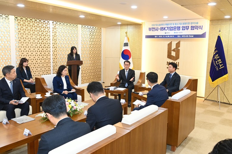 [부천시 세계타임즈=송민수 기자] 부천시와 IBK기업은행이 12월 18일 ‘창업기업 설비투자 특별지원’ 및 ‘중소기업 동행지원 협약대출’ 업무협약을 체결했다. 협약식에는 조용익 부천시장과 김성태 IBK기업은행장을 비롯한 양 기관 관계자가 참석했다.