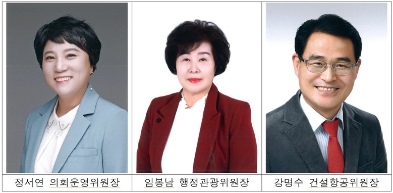 의회운영위원장에 정서연(비례대표, 더불어민주당), 행정관광위원장에 임봉남(비례대표, 국민의힘), 건설항공위원장에 강명수(사남‧용현, 국민의힘) 의원이 각각 선출됐다.